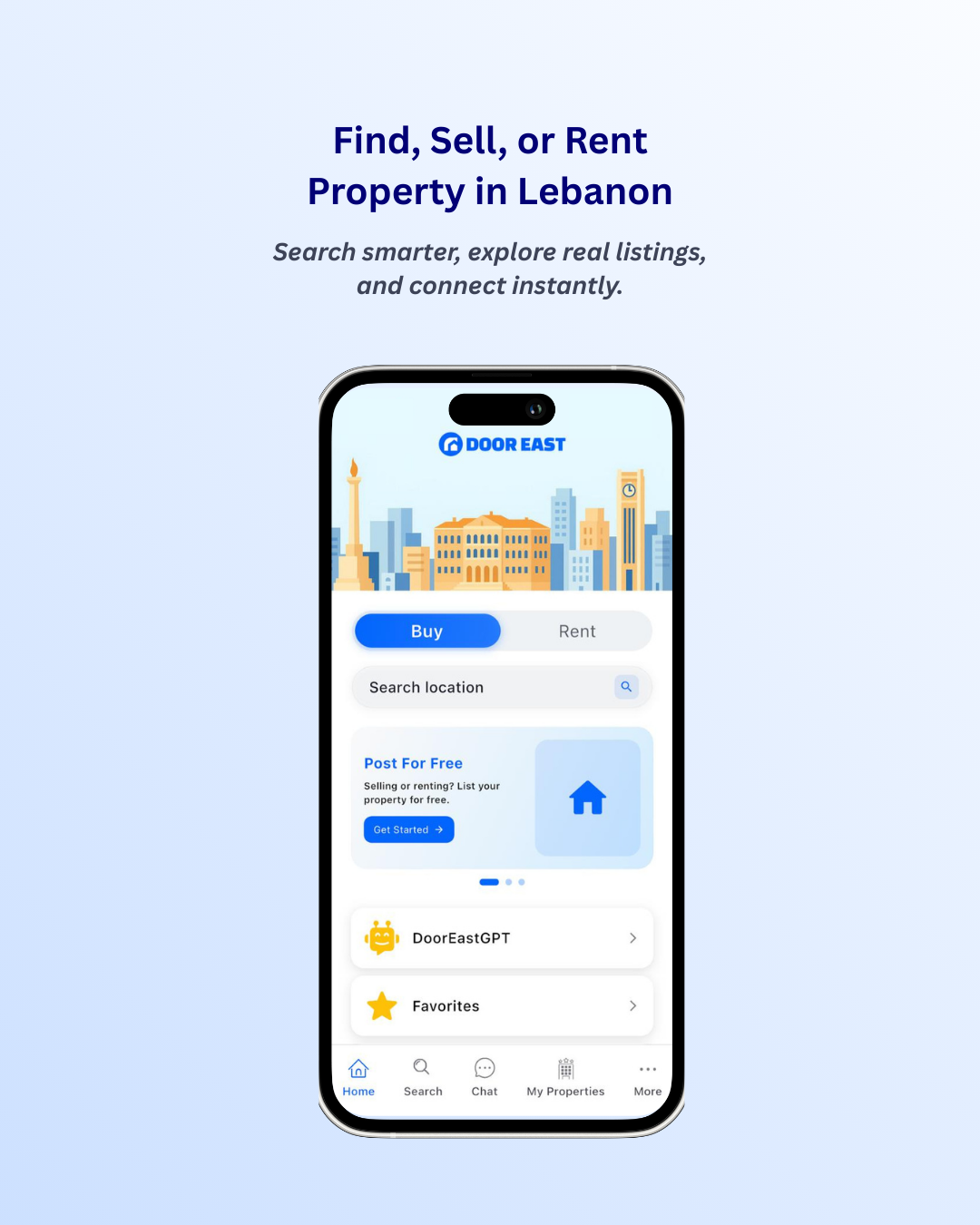 Available at www.dooreast.com, the platform offers thousands of verified listings spanning apartments, houses, offices, commercial buildings, and land across Lebanon. With a clean, intuitive interface designed for ease of use, DoorEast makes finding the right property faster and more transparent than ever before.